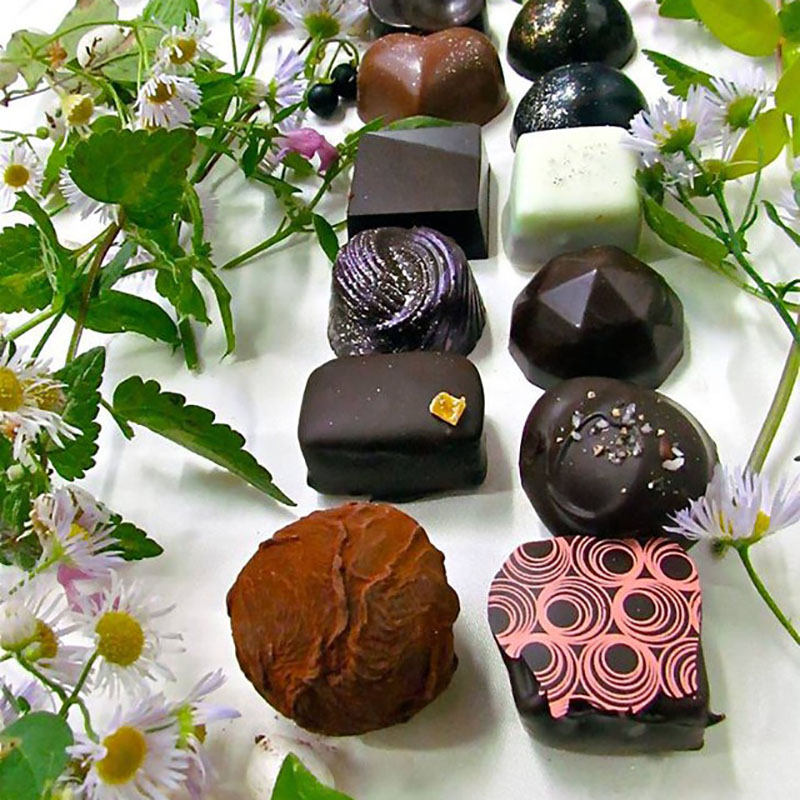 ほおずきや、スミレ、ラベンダーなどの北海道の物を使った珍しいフレーバーのチョコレートが特徴的。